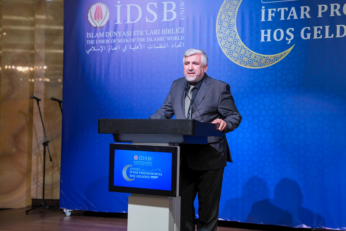İDSB Geleneksel İftar Programı, bu yıl “6 Kıta, 66 Ülke, Tek Ümmet” ilkesi doğrultusunda; bakan yardımcıları, milletvekilleri, belediye başkanları, akademisyenler, kamu kurum temsilcileri, üyelerimiz ve çok sayıda sivil toplum kuruluşu temsilcisinin katılımıyla İstanbul’da gerçekleştirildi. Kur’an-ı Kerim tilavetiyle başlayan program, selamlama konuşmalarıyla devam etti. Selamlama konuşmasını gerçekleştiren İDSB Genel Sekreteri Eyüp Akbal, Ramazan ayının birlik ve kardeşlik ruhuna vurgu yaparak, dünyanın farklı coğrafyalarında yaşanan insani krizlere dikkat çekti. Akbal konuşmasında; Gazze başta olmak üzere Suriye, Yemen, Sudan, Doğu Türkistan ve Arakan’da yaşanan zulüm, savaş ve insan hakları ihlallerinin tüm insanlığın ortak vicdanını yaraladığını ifade ederek, “Bu ve benzeri coğrafyalarda yaşanan acıların son bulması, adaletin ve barışın hâkim olması en büyük duamızdır” dedi.